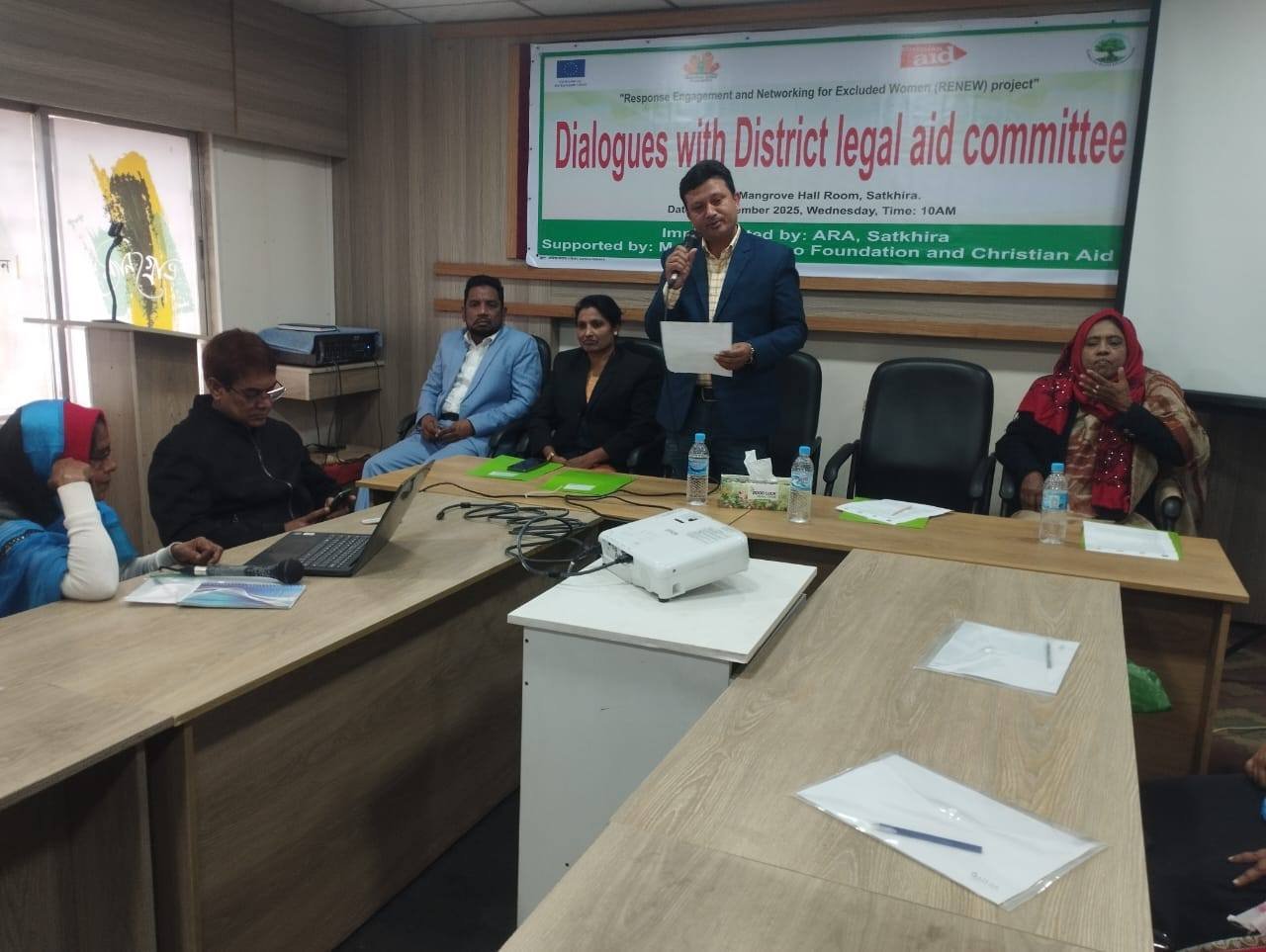 A dialogue meeting with the District Legal Aid Committee was held on Wednesday, 17 December 2025, at 10:00 AM at the Mangrove Conference Hall, Satkhira. The event was organized under the RENEW Project of ARA, with the cooperation of Manusher Jonno Foundation and Christian Aid, and was implemented by ARA. The dialogue was arranged by the Satkhira Municipality Women Protection Forum under the RENEW Project.